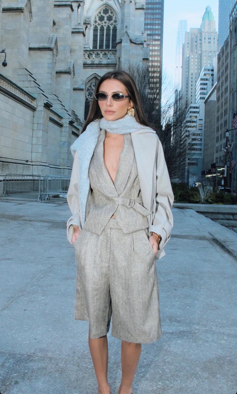 BERMUDA SOCIAL LARISSA -COS TRANSPASSADO COM PASSANTE FECHAMENTO EM BOTÃO E ZIPER, BOLSO FACA, PREGA FRONTAL, BOLSO JAPONES NA PARTE DE TRAS