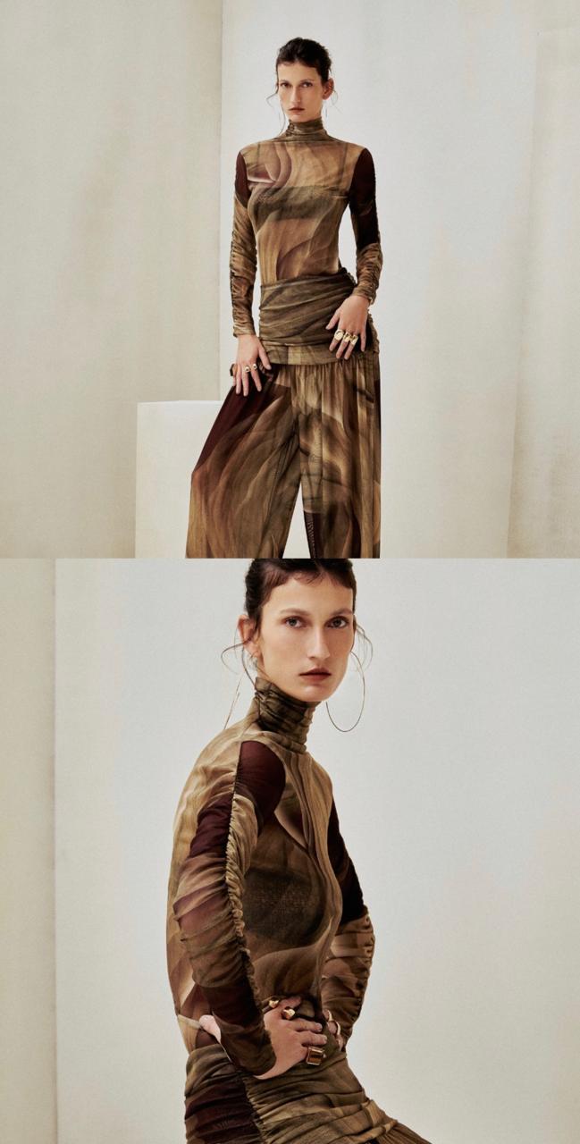 BLUSA DRAPEADA TULE - GOLA ALTA, ESTAMPA EM TOM DE VERDE E MARROM, FRANZIDA NAS MANGAS