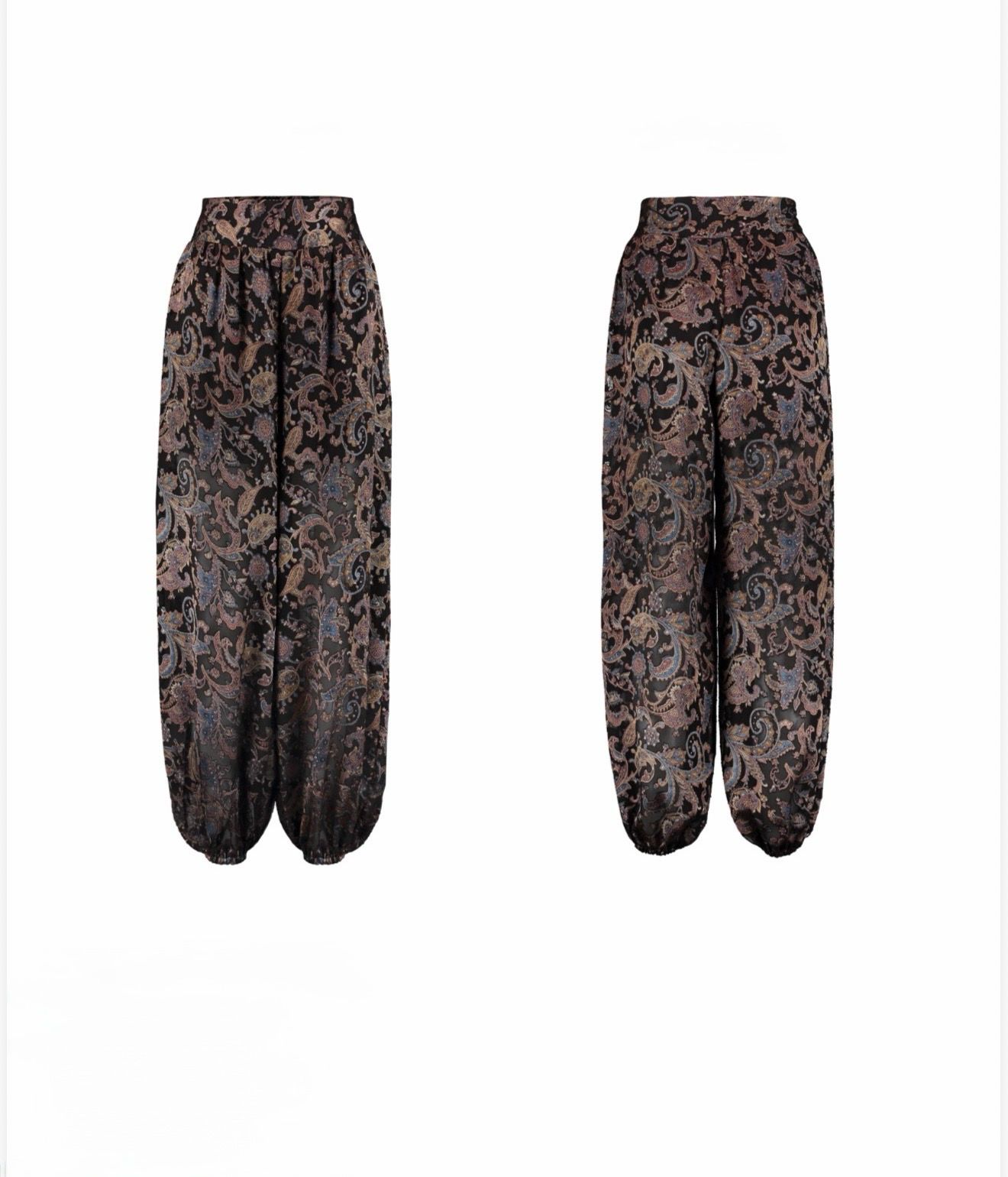 CALÇA DEVORE - COS LARGO FECHAMENTO EM ZIPER NA LATERAL DA CALÇA, COM FORRO DE SHORTS, ELASTICO NA BARRA MODELAGEM ALADIM, ESTAMPA FUNCO MARROM CAFE COM FLORES AZUL, VINHO E CARAMELO