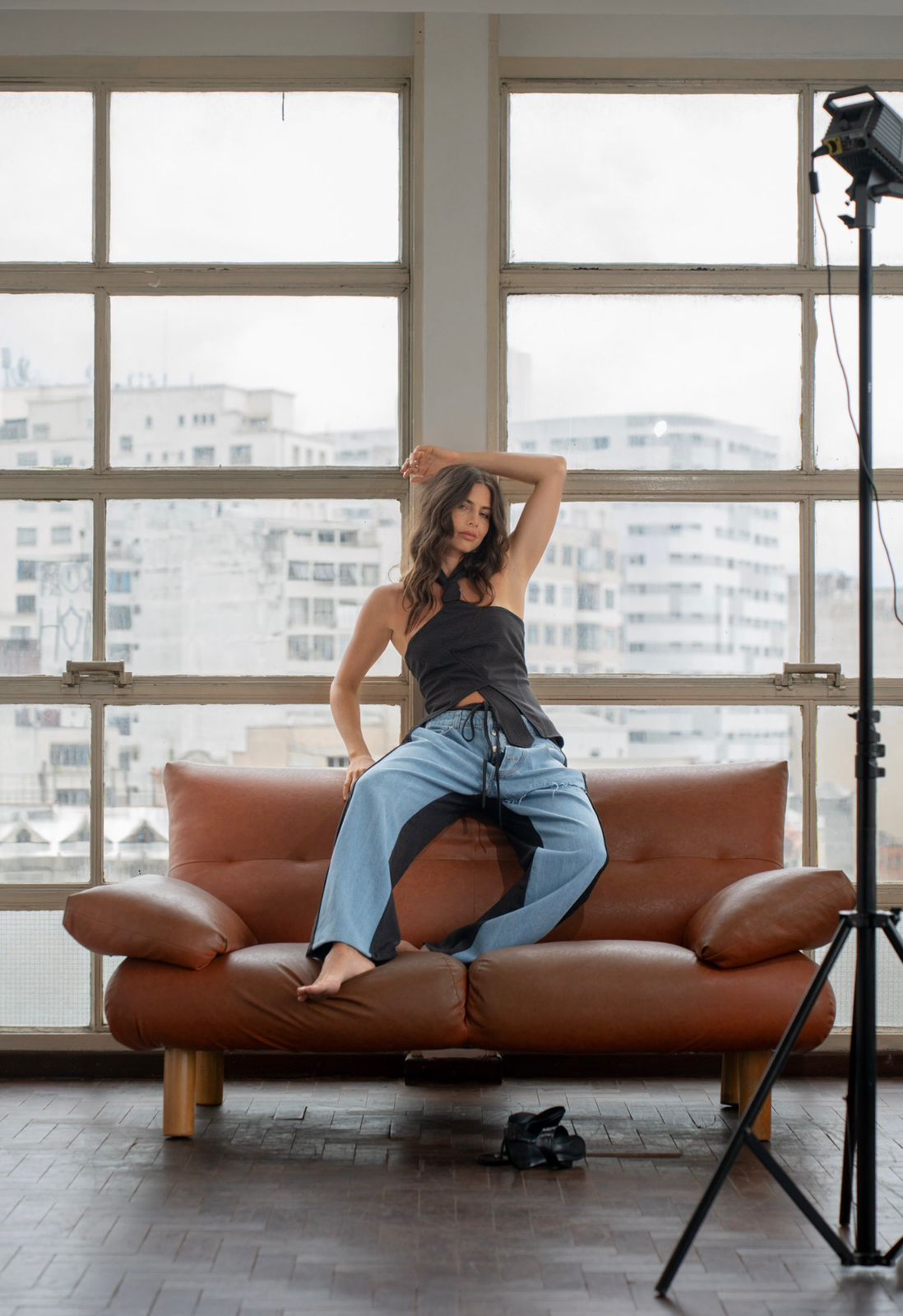 CALÇA KANA - COS COM CORDAO FECHAMENTO EM ZIPER E BOTAO, FRENTE EM JEANS COM RECORTE E PARTE DE TRAS EM TECIDO RISCA DE GIZ