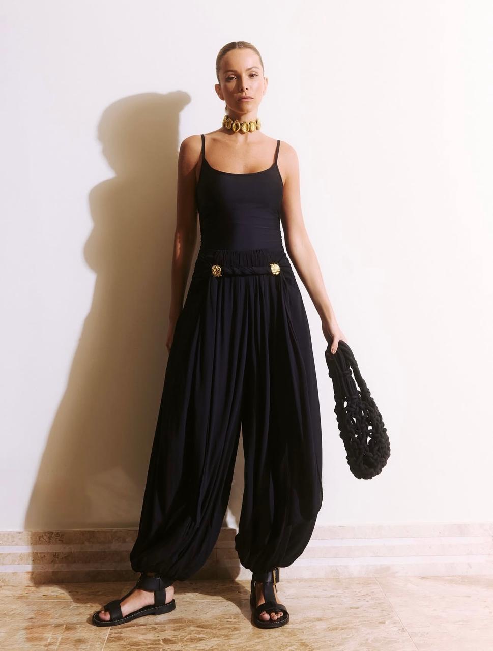 CALÇA ALADIM JOYCE - COS COM DETALHE EM TORÇÃO AJUSTAVEL EM FICELA DE METAL COM FAIXA PENDENTENA PARTE DA FRENTE, ELASTICO NA BARRA, ATRAS COM ELASTICO FECHAMENTO EM ZIPER NA LATERAL