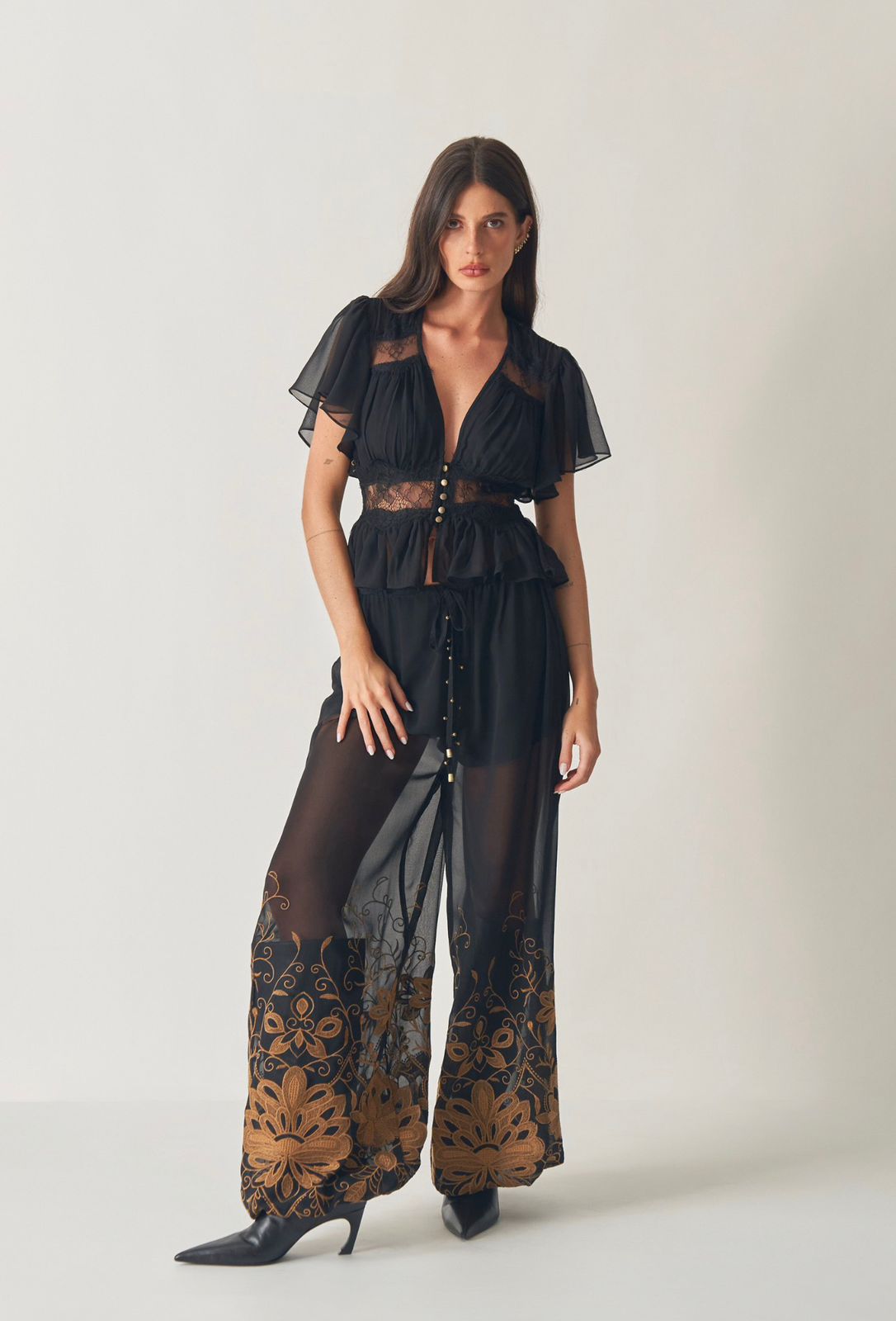 CALÇA KALIRIA - COS COM ELASTICO CORDÃO EM PINGENTE E PONTEIRAS EM METAL, COM SHORTS DE FORRO, BARRA EM ELASTICO COM BORDADO EM FLORES