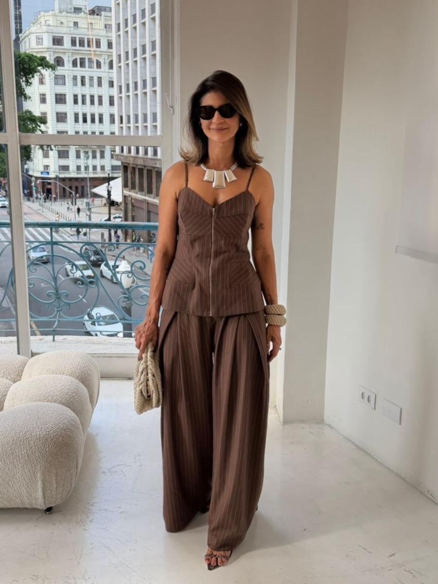 CALÇA RISCA DE GIZ - COM PREGA TRANSPASSADA, FECHAMENTO EM ZIPER NA PARTE FRONTAL, PANTALONA COM PREGA NA PARTE DE TRAS