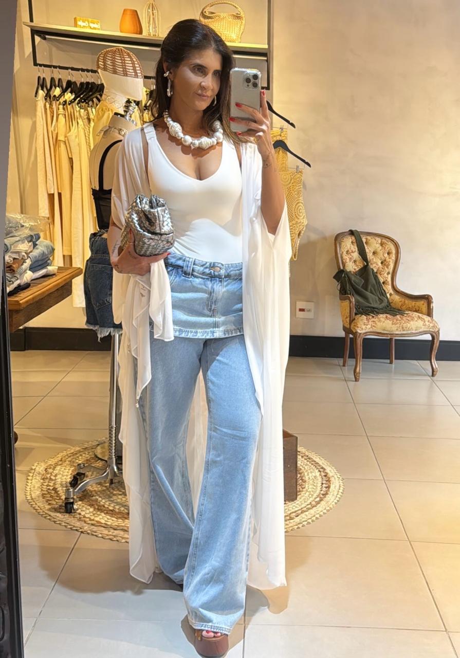 CALÇA SARA - CÓS COM PASSANTE, COM SOBREPOSIÇÃO DE SAIA COM ZIPER PARA FECHAMENTO NA PARTE FRONTAL E NA LATERAL DO QUADRIL, MODELAGEM RETA COM COM DETALHE DE COSTURA DUPLA NA BARRA, PARTE DE TRAS COM SAIA SOBREPOSTA E BOLSO