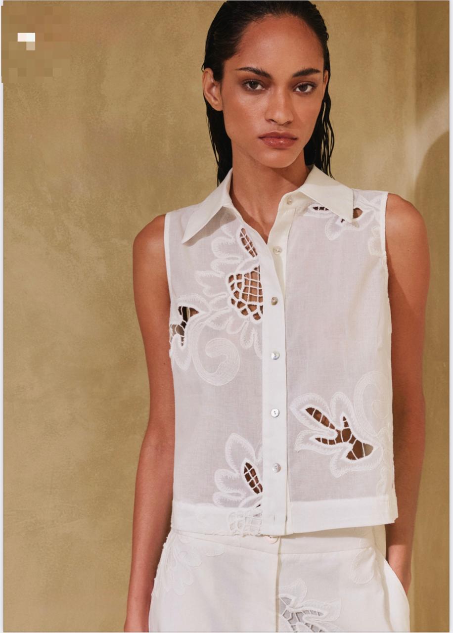 CAMISA BORDADA - DE ALGODÃO COM BORDADO E RECORTE COM FECHAMENTO EM BOTÕES DE MADREPEROLA