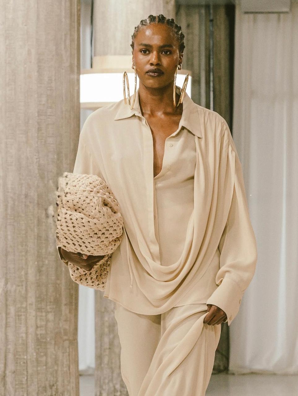CAMISA MARION - FECHAMENTO FRONTAL COM VISTA, MANGA LONGA COM PUNHOS LARGOS, COM DRAPEADO SAINDO DO OMBRO ATE A BARRA
