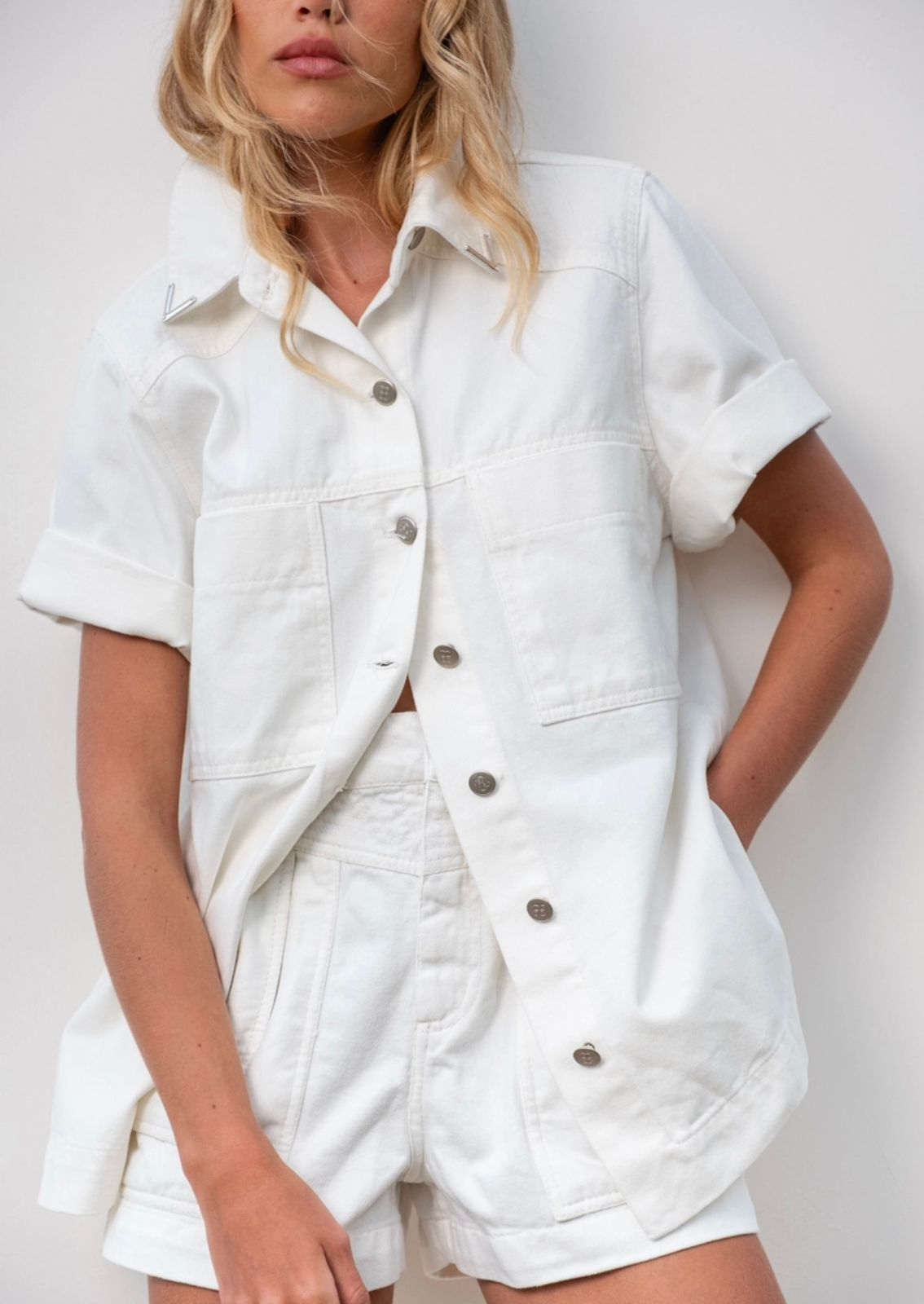 CAMISA OASIS- FECHAMENTO EM BOTÃO FRONTAL E BOLSO QUADRADO, DETALHE DE PESPONTO NO OMBRO, GOLA COM PONTEIRA EM METAL, FENDA NA LATERAL PREGA MACHO NA PARTE DE TRAS