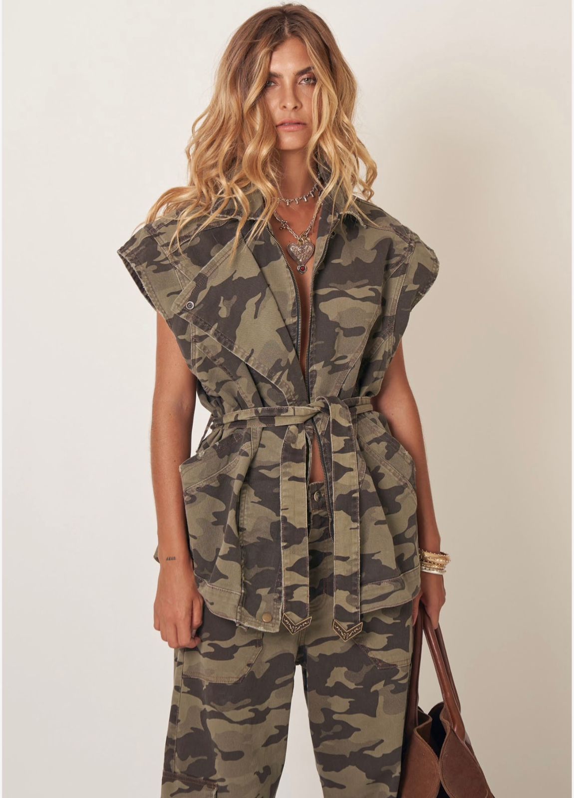 COLETE CAMUFLADO - FECHAMENTO EM ZIPER NA PARTE FRONTAL, COM RECORTE E BOLSO FRONTAL, ACOMPANHA CINTO FAIXA COM PONTEIRA EM METAL