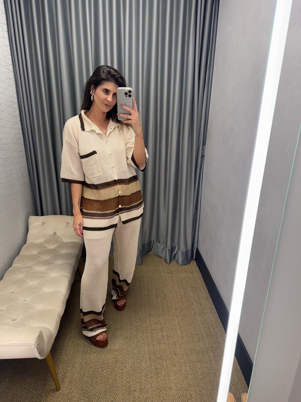 CONJUNTO EDI - CAMISA COM FECHAMENTO EM BOTÕES FORRADOS NA PARTE FRONTAL FORRADA NA PARTE DO BUSTO, COM DETALHES DE LISTRA NA BARRA / CALÇA COS COM ELASTICO E CORDÃO NO COS, COM SHORTS DE FORRO NA PARTE INTERNA DETALHE DE LISTRAS NA BARRA