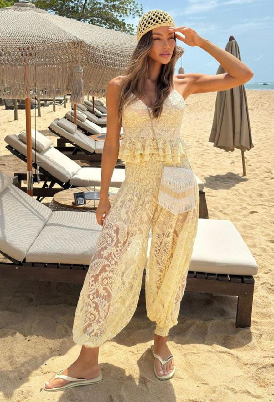 CROPPED RENDA - ALÇA COM REGULAGEM PARA AMARRAÇÃO NA PARTE DE TRAS, RECORTE ABAIXO DO BUSTO COM CAMADA DE BABADO POR TODA A PECA