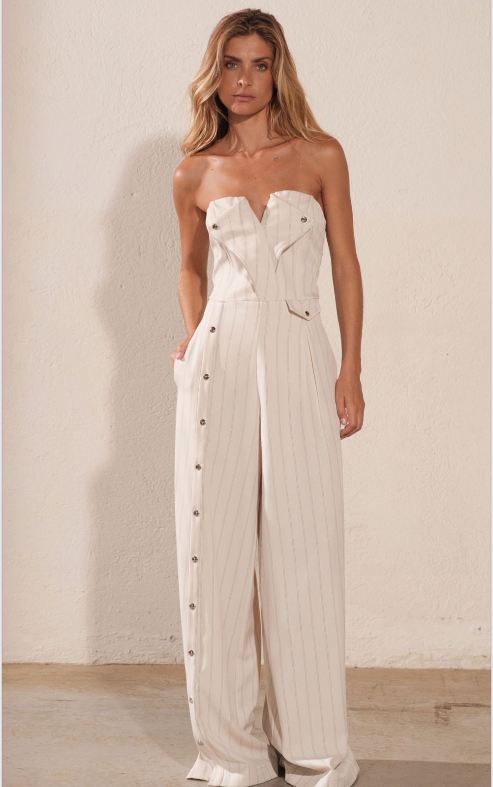 MACACAO FERNANDA: SEM ALÇA DECOTE V COM BARBATANAS E SILICONE INTERNO, DETALHE EM ZIPER E BOTÃO NO BUSTO, ESTAMPA RISCA DE GIZ, DESCI PANTALONA COM BOTÕES DE PRESSÃO, BOLSOS LATERAIS, COSTAS COM ELASTEX E FECHAMENTO EM ZIPER.