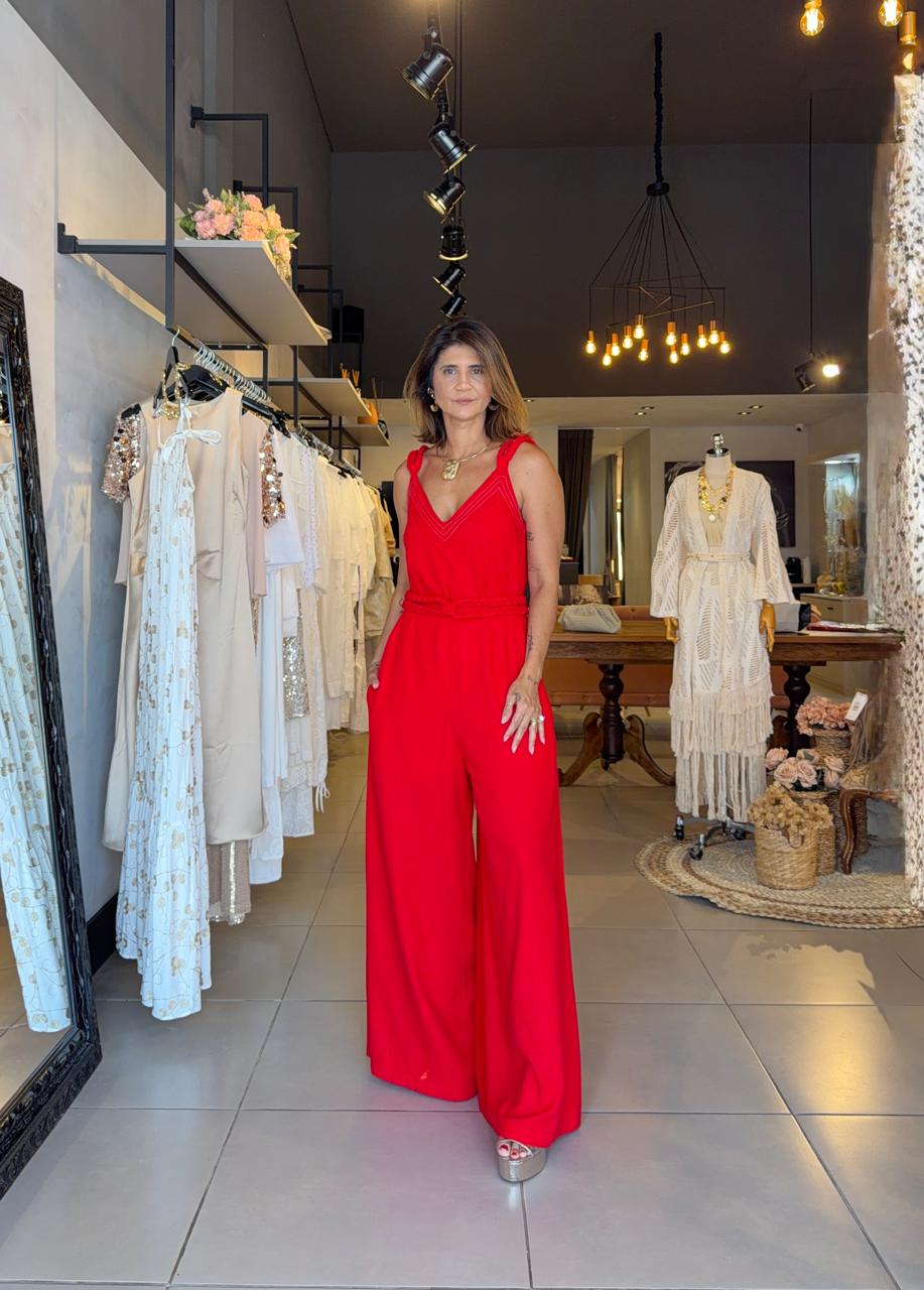 MACACÃO PESPONTO - ALÇA TRANÇADA DECOTE EM V PESPONTADO, BOLSO FACA TODO FORRADO ACOMPANHA CINTO TRANÇADO E PESPONTADO
