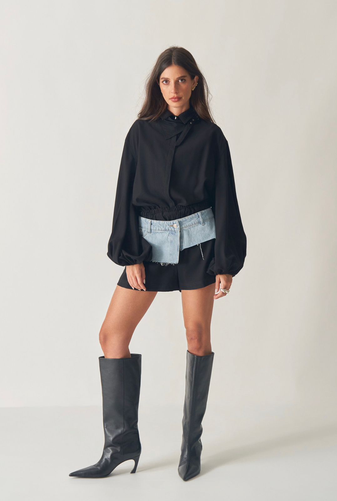 MACAQUINHO DAKOTA - FECHAMENTO EM BOTÕES ELASTICO NA CINTURA, COM PALA EM JEANS NA PARTE FRONTAL, MANGA LONA COM ELASTICO NO PUNHO, PALA NA PARTE DE TRAS, ACOMPANHA LENÇO COM FIVELA DE METAL PARA FECHAMENTO