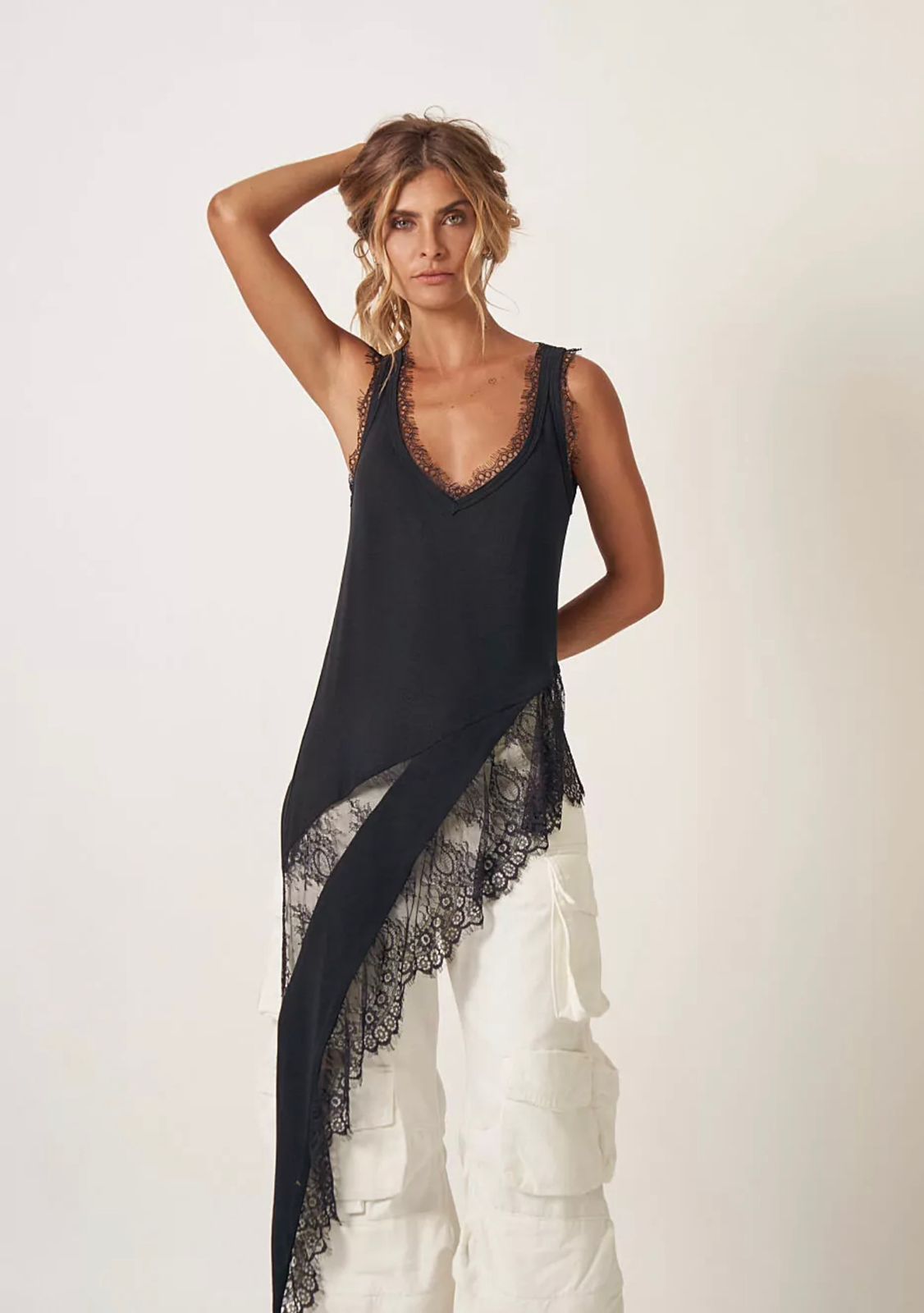 REGATA AGNES - ALÇA LARGA COM RENDA POR TODO DECOTE FRENTE E COSTAS, BARRA ASSIMETRICA COM RECORTES DE RENDA