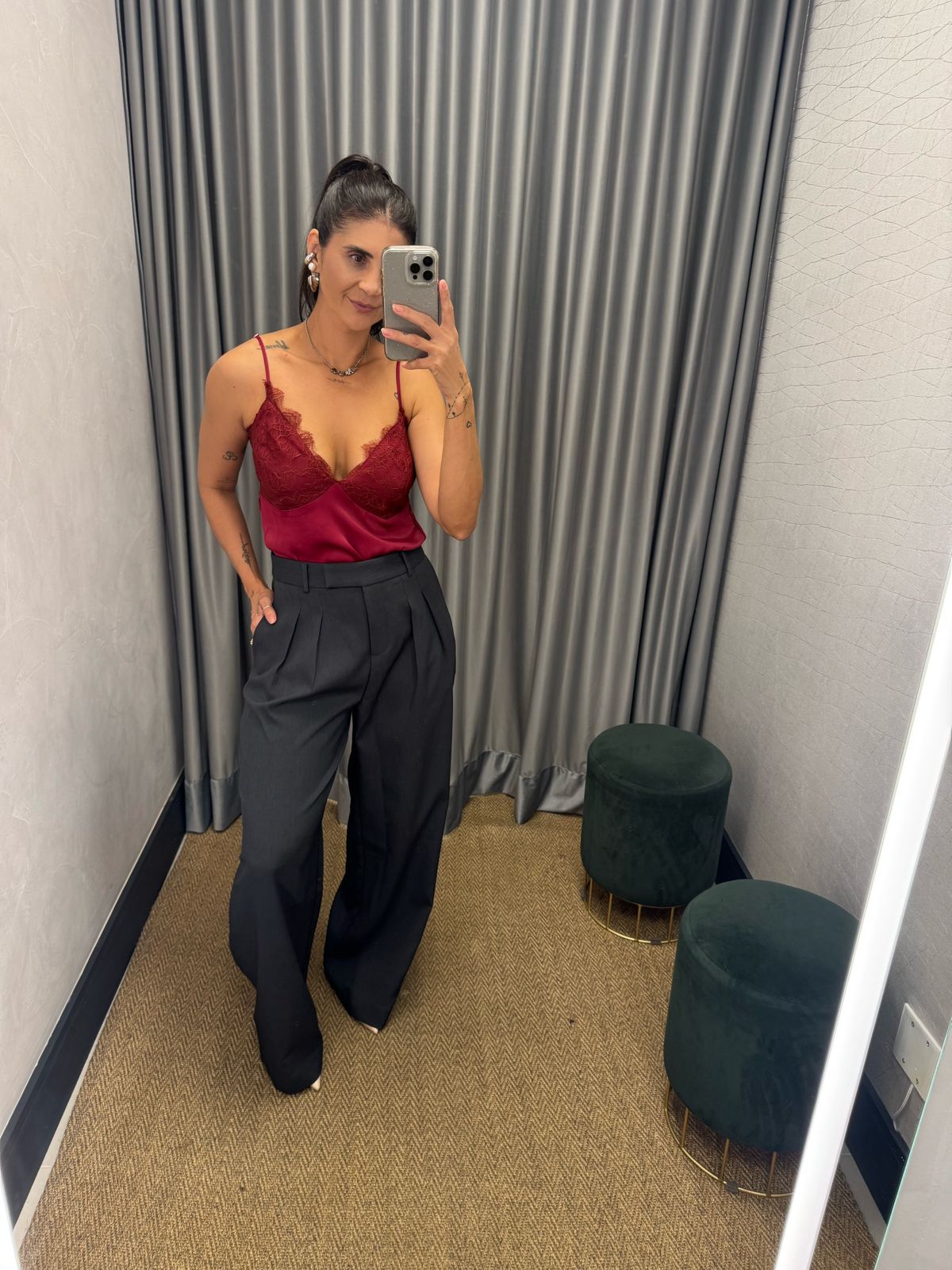 REGATA DUNA - COM ALÇA REGULAVEL, DECOTE COM RECORTE ABAIXO DO SEIO FORRADO EM RENDA, COM DETALHE NAS COSTAS DE RENDA