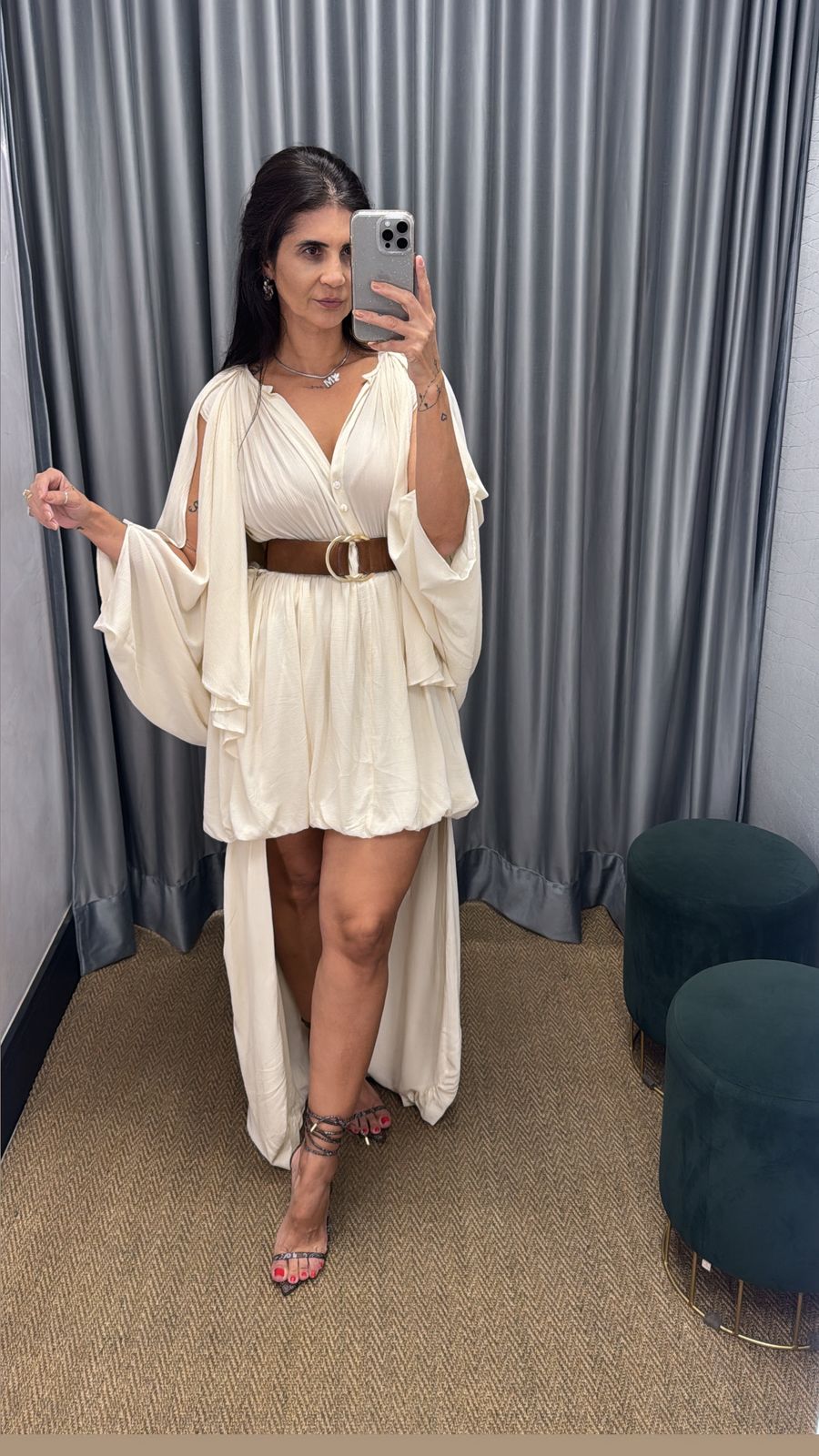 VESTIDO BALONE: MANGA AMPLA COM RECORT, DECOTE V COM BOTÕES, ELASTICO NA CINTURA, SAIA FORRADO, ALONGADA NA PARTE DE TRÁS.