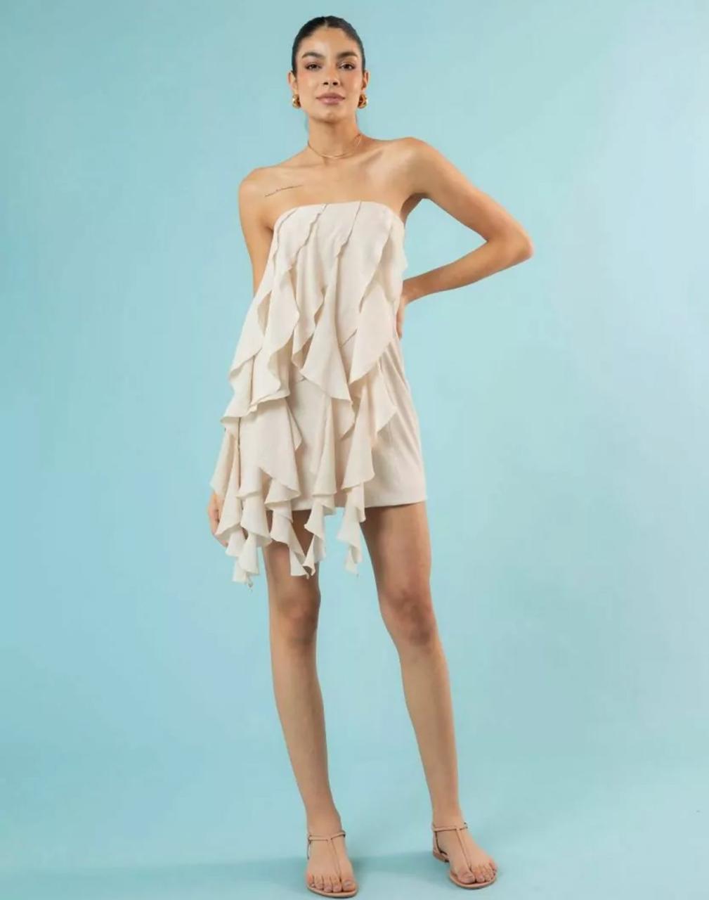 VESTIDO - SEM ALÇA COM SILICONE NO BUSTO PARA SUSTENTAÇÃO, AJUSTADO AO CORPO FORRADO COM FECHAMENTO EM ZIPER MA PARTE DE TRAS, COM DETALHE EM TIRAS DE BABADO PELA PEÇA NA PARTE FRONTAL