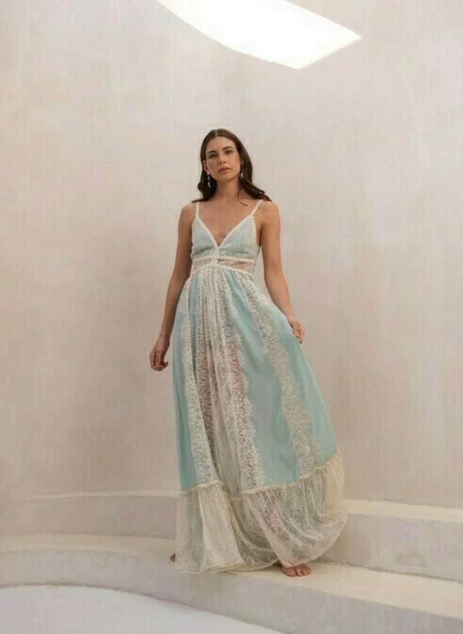 VESTIDO HORIZONTE - ALÇA COM REGULAGEM DE ALTURA COM DETALHE EM RENDA POR TODA ALÇA, BUSTO COM RECORTE ABAIXO DO SEIO, DETALHE EM RENDA VAZADA, SAIA E BARRA COM RECORTES EM RENDA, TODO FORRADO FECHAMENTO EM ZIPER COM DETALHE DE ELASTEX NAS COSTAS
