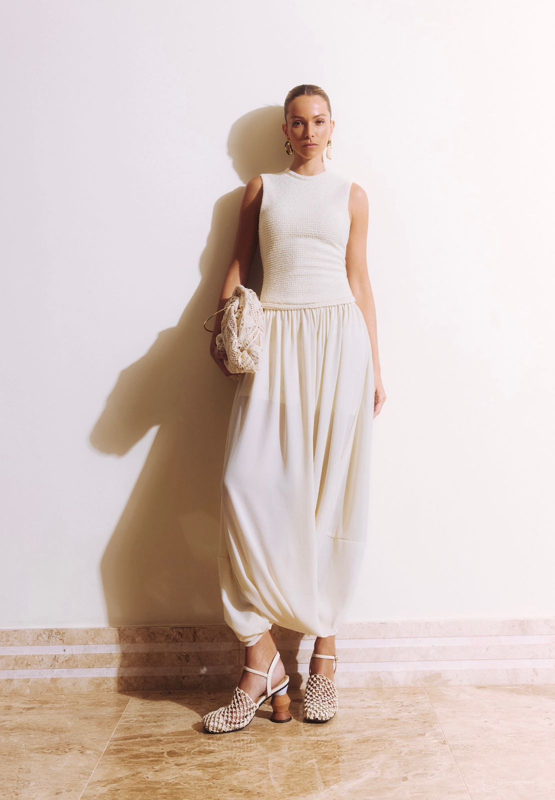 VESTIDO JULIA - MALHA TEXTURIZADA, GOLA CARECA CINTURA BAIXA, COM RECORTE EM ROLETE NA CINTURA, DESCE SAIA BALONE EM CHIFFON FLUIDO, FECHAMENTO EM BOTAO FORRADO E ZIPER INVISIVEL NA PARTE DE TRAS, CORPO TODO DUPLO SAIA COM SHORTS DE FORRO