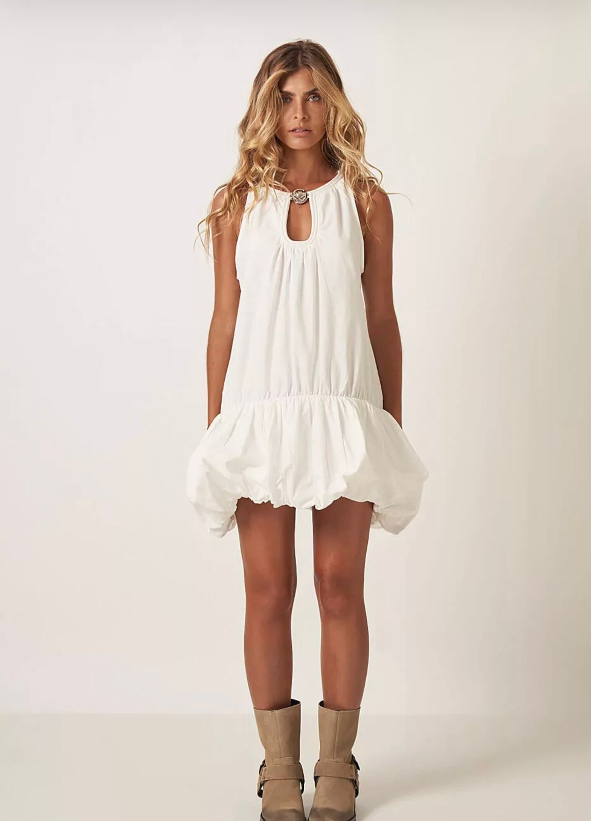 VESTIDO MICA - DECOTE COM FIVELA EM METAL, FRANZIDO BARRA BALONE, DECOTE EM U NAS COSTAS COM AJUSTE