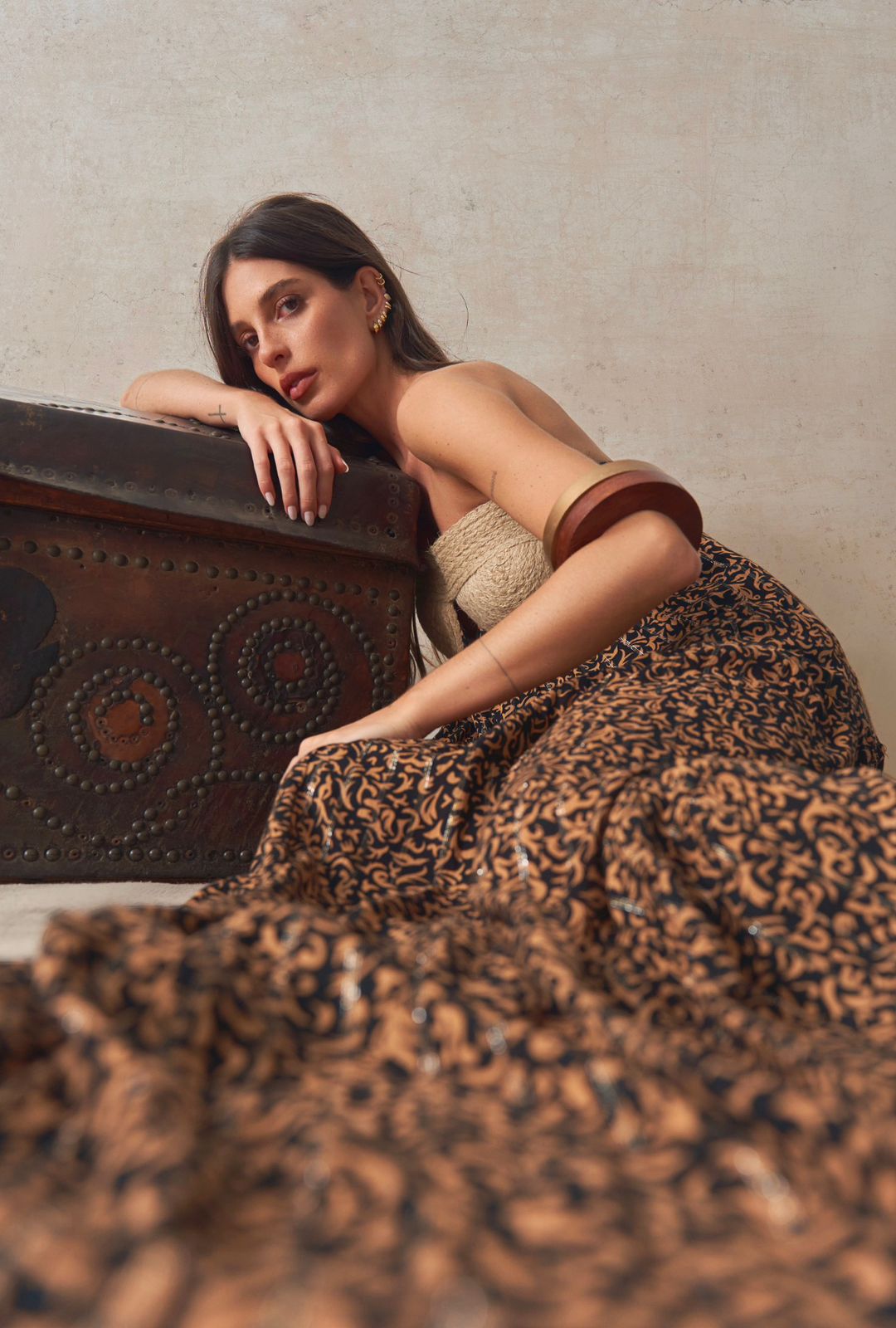 VESTIDO RENASCER - LONGO, ESTAMPADO, COM FIO DE LUREX, BUSTO EM CORDA FORRADO COM SILICONE PARA SUSTENTAÇÃOFORRADO ATE 1/2 DE COXA, FECHAMENTO EM ELASTEX COM ZIPER NA PARTE DE TRAS