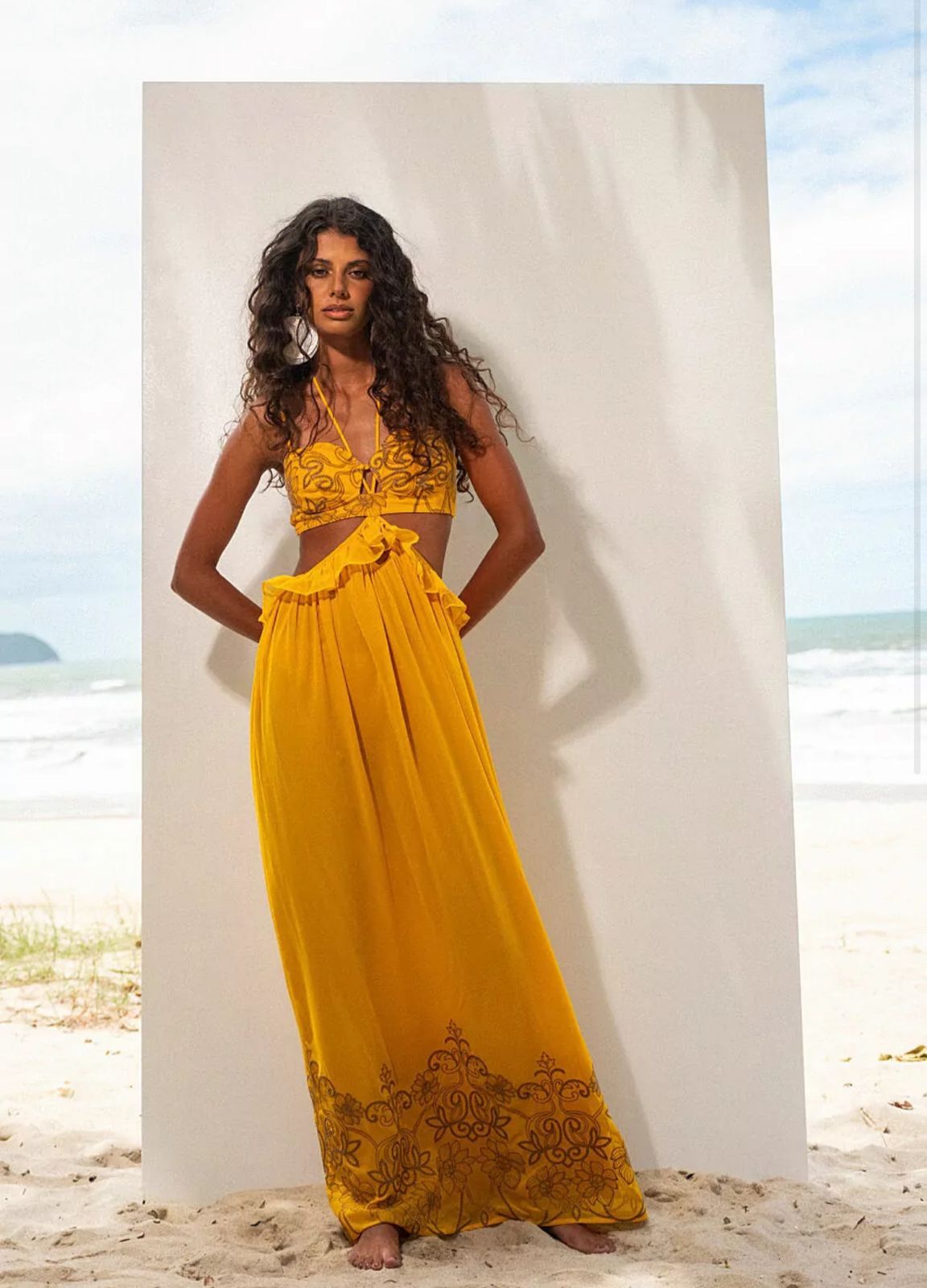 VESTIDO TIVOLI - AMARRAÇÃO NO PESCOÇO, BUSTO COM BORDADO, RECORTE NA ALTURA DA CINTURA, DESCE SAIA COM BORDADO NA BARRA BORDADO
